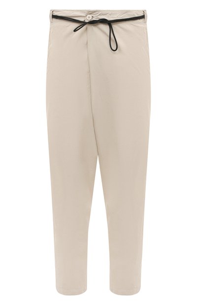 Для пошива светло-бежевых брюк использовали плотную парашютную ткань, выполненную из прочного хлопка. Для создания необычного силуэта дизайнеры марки занизили шаговую линию изделия, создав запах спереди, а в пояс-кулиску продели шнур контрастного черного цвета.