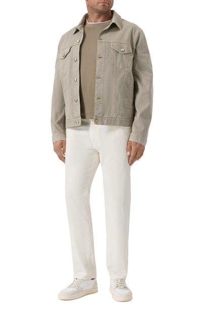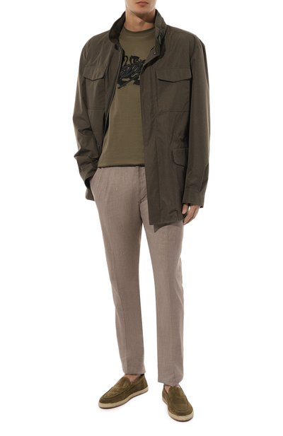 Футболка оттенка хаки напоминает о своей принадлежности бренду черной вышивкой в виде знакового восьмиугольника, в который заключили монограмму SR. Цвет узора поддерживают полосы на манжетах и плечах. Для изготовления модели выбрали гладкий шелковистый хлопок, который исключительно приятно ощущается на теле и сохраняет комфортный микроклимат.