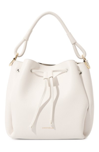 Белая сумка Eclyps с широкими боковыми панелями и двумя короткими ручками получилась вместительной: внутри хватит места для планшета, зонта, кошелька, а во внутреннем кармане удобно хранить смартфон и ключи. Для изготовления аксессуара, затягивающегося узким шнуром, использовали мягкую зерненую кожу. Модель с золотистыми тисненым логотипом и фурнитурой дополнили съемным брендированным ремнем.