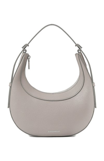 Для пошива светло-серой полукруглой сумки Whisper выбрали плотную матовую кожу с крупнозернистой фактурой. Из такого же материала выполнили короткую ручку, которую можно отстегнуть, заменив плечевым ремнем в тон. Крепления, в которые они продеваются, изготовили в форме знакового плектра. В модель на молнии поместятся смартфон и картхолдер.
