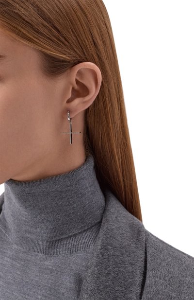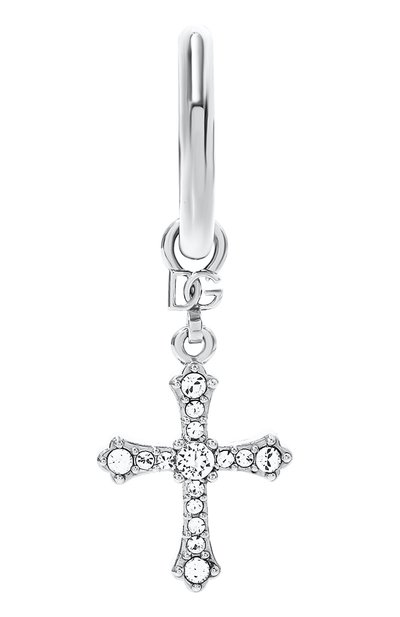 Крупную моносерьгу-кольцо выполнили из прочного ювелирного сплава с серебристым покрытием, не содержащим никеля. Холодный блеск металла усил ивает сияние прозрачных кристаллов, которыми инкрустировали подвеску в виде католического креста. Сверху ее декорировали миниатюрной монограммой DG, деликатно указав на принадлежность аксессуара бренду.