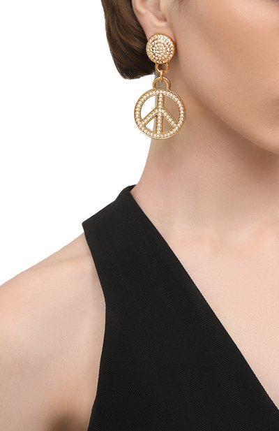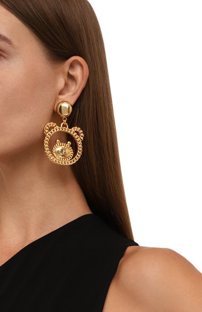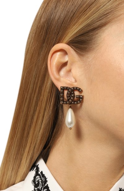 Основание серебристых кли псов выполнили в виде полусферы из легкого прочного акрила с покрытием цвета оружейной бронзы. Украшение дополнили динамичной подвеской в виде ажурной монограммы DG из отполированного до блеска посеребренного ювелирного сплава. Силиконовые накладки на застежках не повредят мочку.