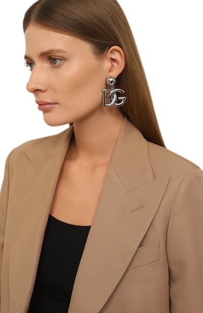 Основание серебристых клипсов выполнили в виде полусферы из легкого прочного акрила с покрытием цвета оружейной бронзы. Украшение дополнили динамичной подвеской в виде ажурной монограммы DG из отполированного до блеска посеребренного ювелирного сплава. Силиконовые накладки на застежках не повредят мочку.
