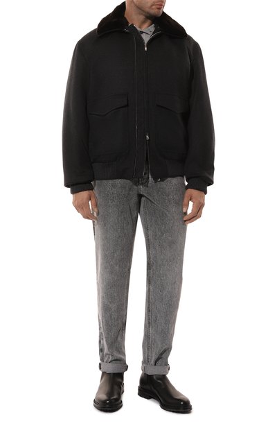 Чернильно-синий бомбер с манжетами и поясом из эластичного трикотажа сшили из смеси фактурной шерсти и благородного кашемира. Плотный материал с коротким нежным ворсом отлично защищает от ветра и поддерживает оптимальный микроклимат. Модель с встречной молнией и крупными накладными карманами дополнили воротником, отделанным мехом нутрии.