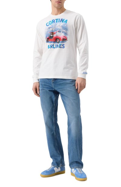 Голубые джинсы с эффектом делаве гармонично впишутся в повседневный образ с футболкой и пиджаком. Модель получилась особенно комфортной за счет сочетания прямого кроя и фирменного эластичного денима Stretch Tek Earthkind, сотканного из отборного органического хлопка. Принадлежность марке обозначили небольшими нашивками сзади.