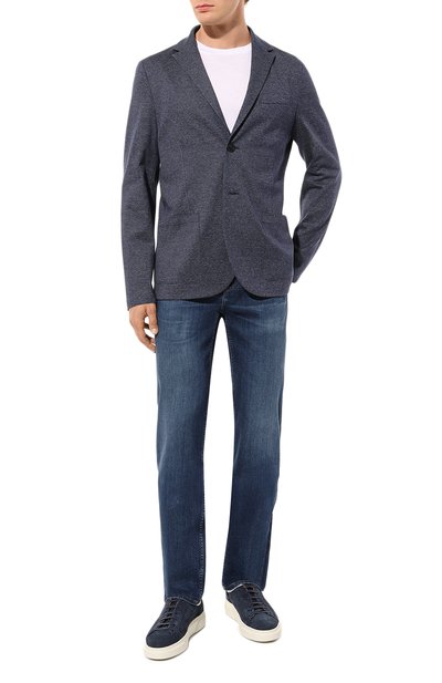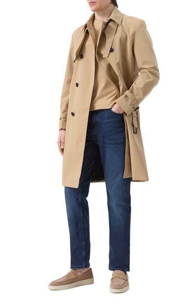 Синие джинсы с классической посадкой сшиты из гладкого хлопка с небольшими потертостями. Материал с добавлением стрейчевых нитей хорошо пропускает воздух, а изделия из него садятся точно по фигуре и надолго сохраняют заданную форму. Наши стилисты предлагают создать образ с футболкой и курткой бежевого цвета и коричневыми лоферами.
