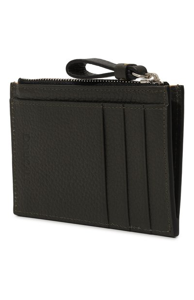 Небольшое темно-синее портмоне сшили из матовой крупнозернистой кожи, которая не боится царапин. Аксессуар состоит из трех слотов для кредитных карт, отсека для чеков и кармана на молнии, в котором удобно хранить монеты. Роль декора отдали стежку, выполненному желтыми нитями на передней панели.