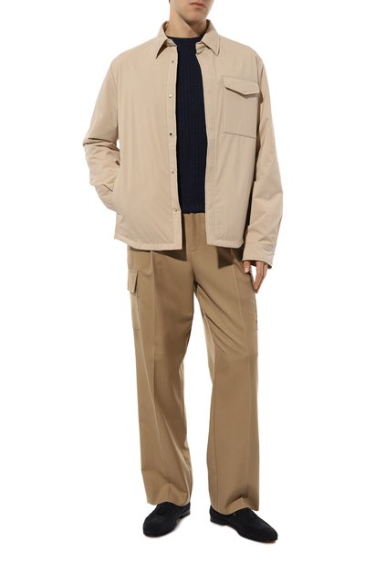 Лоферы выполнили из мягкой замши, бархатистая фактура которой приглушает темно-синий оттенок, делая его более спокойным. Чтобы пара на сплошной подошве максимально удобно садилась по ноге, материал бережно выделали до легкой эластичности. Союзку украсили перемычкой из шнуров, завязанных морским прямым узлом.