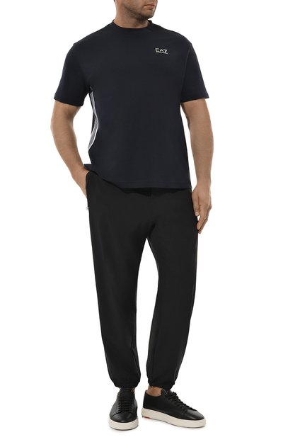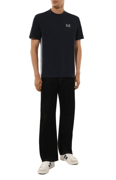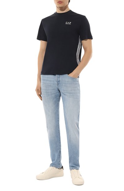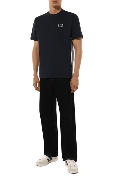 Синюю однотонную футболку украсили контрастным логотипом, увеличенную версию которого повторили сзади. Для пошива легкой модели использовали мягкий хлопковый трикотаж, обеспечивающий оптимальный микроклимат. Наши стилисты предлагают создать непринужденный образ с карго и рубашкой.