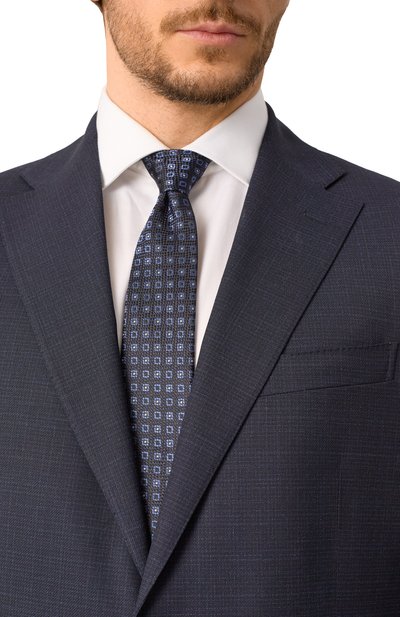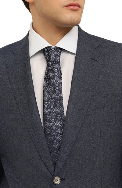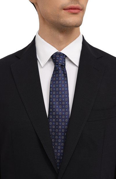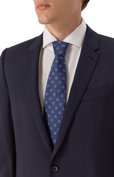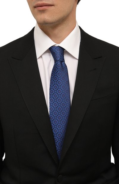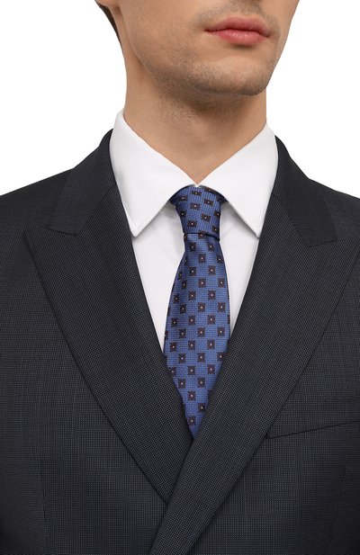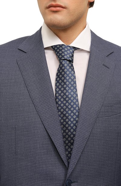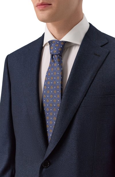 Синий галстук изготовили из плотного шелка, из-за атласного блеска которого фактурный паттерн выглядит более рельефным. Модель с эластичными швами, выполненными вручную, хорошо драпируется и не перекручивается в узле, сохраняя четкую вертикаль.