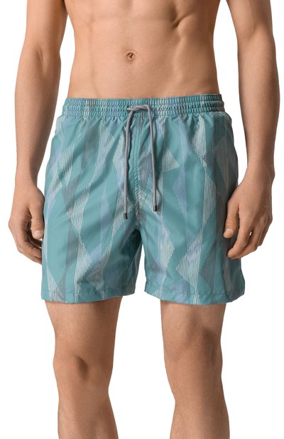 Для пошива плавок-шорт с эластичным поясом-кулиской использовали гладкий шелковистый нейлон, поэтому почти невесомое изделие не боится воздействия соленой и хлорированной воды и быстро сохнет. Белоснежную модель украсили разноцветными лампасами с крупным жаккардовым логотипом.