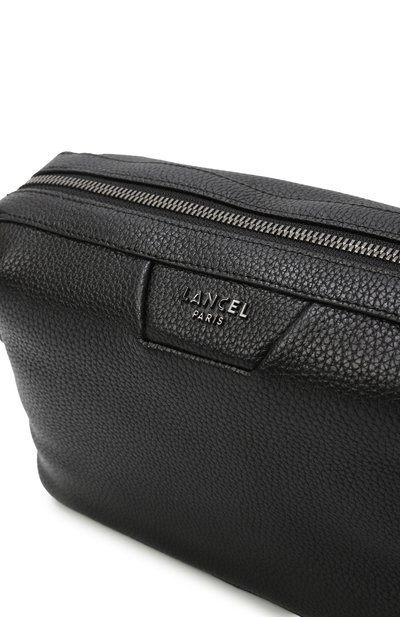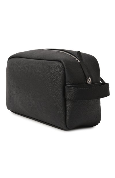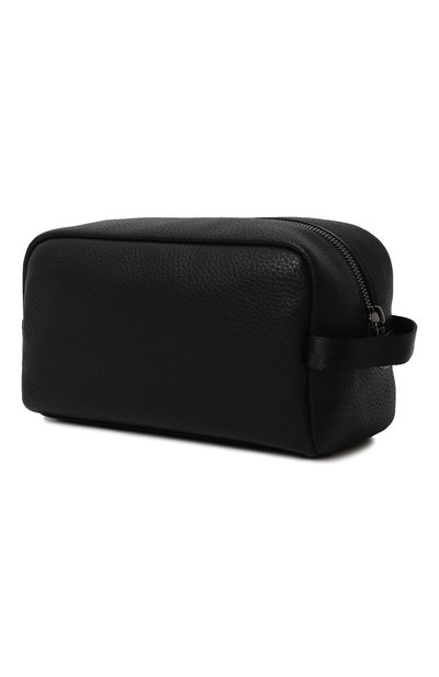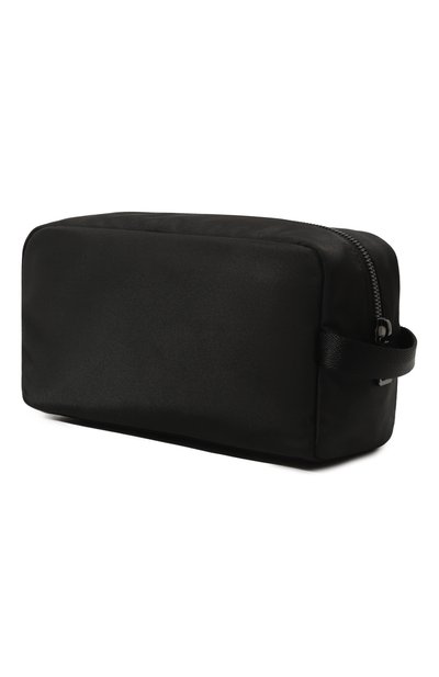 Для изготовления черного несессера со съемной брендированной ручкой-петлей использовали прочный плотный текстиль, напоминающий фактурную кожу. Один угол аксессуара, застегивающегося на молнию, декорировали рельефным тиснением в виде тотемного орла и логотипом.