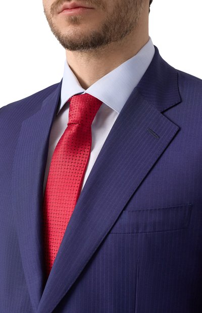 Красный галстук с сине-голубым орнаментом в горох выполнили вручную в технике семи сложений из цельного отреза мягкого матового шелка. Материал хорошо драпируется, делая узел скульптурным и четким. Сзади детали соединили эластичным швом, который не стягивает ткань и не заставляет ее перекручиваться.