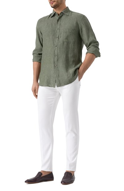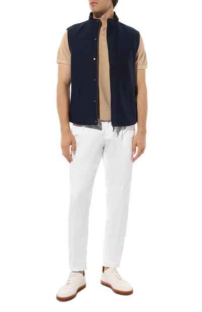 Белые зауженные брюки с четырьмя карманами выполнены из дышащего хлопкового велюра. Процесс создания каждого изделия состоит из множества операций, большая часть которых выполняется вручную. В результате модель с усиленными швами безупречно садится по фигуре и не ограничивает движения. О принадлежности марке говорят фирменная пуговица и жакрон сзади на поясе.