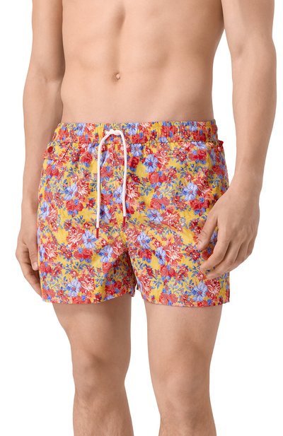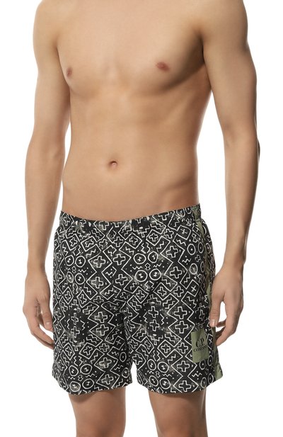 Яркость разноцветных плавок-шортов вывели на максимум, совместив в декоре графичный орнамент и акварельный паттерн в виде фламинго. Для пошива изделия с эластичным поясом-кулиской использовали тонкий быстросохнущий п олиэстер. Спереди модель дополнили карманом с фирменной брендированной кнопкой, а сзади — с вышитым логотипом марки.