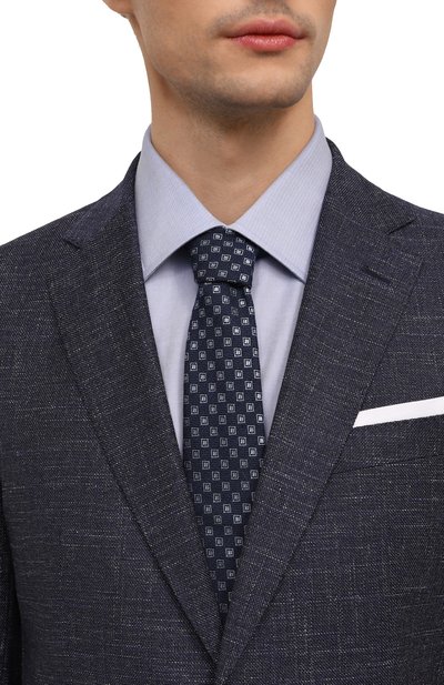 Широкий темно-синий галстук с голубым цветочно-геометрическим принтом сшили из мягкого шелка с деликатным блеском. Аксессуар, выполненный без подклада в технике seven fold, хорошо драпируется и долго не теряет форму. Длина модели позволяет экспериментировать с крупными узлами.