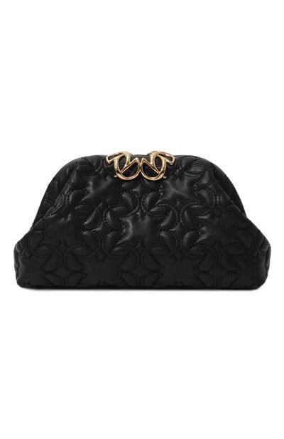 Для пошива черного клатча из коллекции Matelassé Эли Сааб выбрал нежную мелкозернистую кожу. Ее деликатный блеск придает визуальный объем стеганому орнаменту из ажурной эмблемы марки, которому вторят золотистые накладки. В аксессуар с рамочным замком и внутренним карманом поместятся телефон, помада и картхолдер.