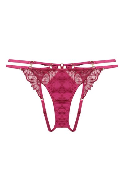 Малиновые слипы практически полностью состоят из переплетения атласных ремешков, скрепленных пряжками и кольцами с покрытием из 24-каратного золота. Между ними — вставки из прозрачного тюля с вышитым готическим орнаментом. Комфорт в течение дня призвана обеспечить ластовица из мягкого хлопкового трикотажа.