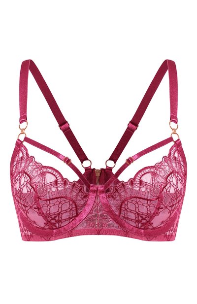 Для изготовления малинового бюстгальтера-балконета использовали комбинацию полупрозрачного тонкого тюля с вышитым геометрическим узором, гладкого атласа и шелковистого джерси. Модель с широким двойным поясом и узкими бретелями, создающими сзади V-образный мотив, застегивается молнией на спинке. Ее, как и всю фурнитуру, регулирующую посадку, покрыли слоем 24-каратного золота.