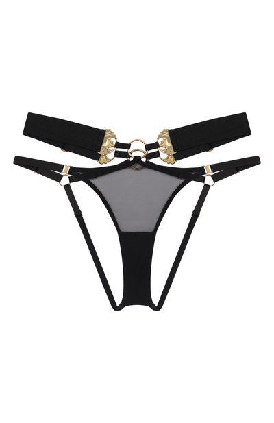 Черные стринги выполнили из полупрозрачного тонкого материала, дополнив деталями из шелковистой микрофибры с атласным блеском. Роль декора отдали конструкциям из узких ремешков и металлической фурнитуры с покрытием 24-каратным золотом. Слайдерами можно отрегулировать посадку на талии.