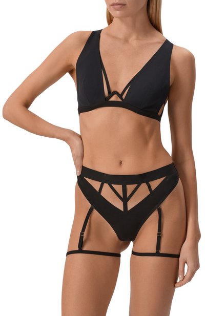 Этот изумрудно-зеленый бюстгальтер с треугольными чашечками словно надели поверх полупрозрачного бандо: такое впечатление создают двухслойная конструкция и сочетание гладкого эластичного атласа и тонкого легкого тюля. Модель дополнили регулируемыми двойными поясом и бретелями с фурнитурой, покрытой 24-каратным золотом.
