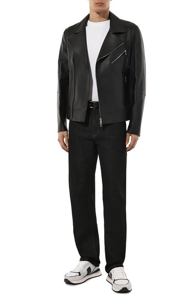 Для пошива белой футболки выбрали тонкое хлопковое джерси, которое хорошо пропускает воздух и поддерживает комфортный микроклимат. Спереди изделие украсили небольшим логотипом бренда, который вышили нитями в тон. Круглую горловину подчеркнули контрастной каймой.