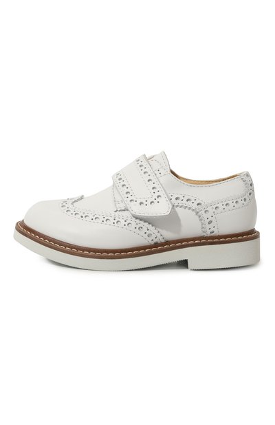 Ажурный узор в технике перфорации придает светло-бежевым дерби сходство с брогами. Для изготовления туфель использовали мягкую матовую кожу, выделанную вручную до комфортной эластичности. Модель на гибкой подошве с устойчивым каблуком дополнили регулируемым ремешком велкро, поэтому она подойдет для стопы с любым подъемом.