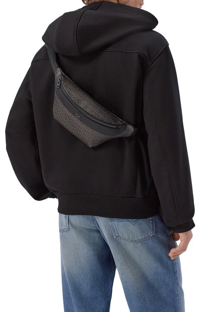 Поясную сумку с брендированными пуллером и биркой сшили из черной плотной ткани. Изделия с внутренним карманом дополнили тремя внешними, поэтому в аксессуар поместятся телефон, картхолдер, ключи и наушники. Модель с фастексом на широком текстильном ремне удобно носить на талии или через плечо.