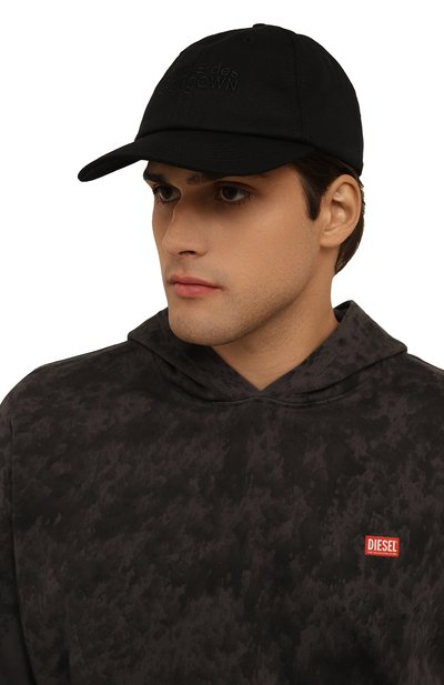 Плотный хлопковый твил превращает черную бейсболку в надежную защиту от ветра и солнца. С тканью почти сливается крупная монограмма PJS в тон, вышитая спереди, а едва заметные светлые полосы на швах и козырьке имитируют потертости. Посадку аксессуара регулирует ремешок со скользящей пряжкой сзади.