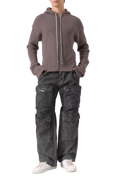 Нейтральный бежевый цвет и отсутствие декора сделали кардиган, застегивающийся на встречную молнию, универсальным. За комфорт в течение дня отвечает нежная легкая шерсть, усиленная шелковистой вискозой и дополненная воздушным кашемиром из вычесанного вручную пуха горных коз. Модель с рельефным узором усовершенствовали капюшоном.