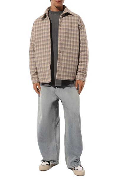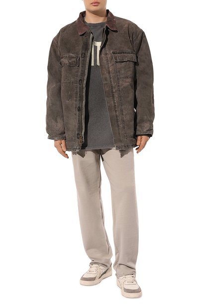 Окрашенная в готовом виде футболка кажется выцветшей — оттенок получился неоднородным, с меланжевым эффектом. Плотный хлопок хорошо держит форму и не вытягивается после стирки. Принт на груди имитирует рукописный ярлык. Сзади под горловиной разместили брендированный текстильный патч.