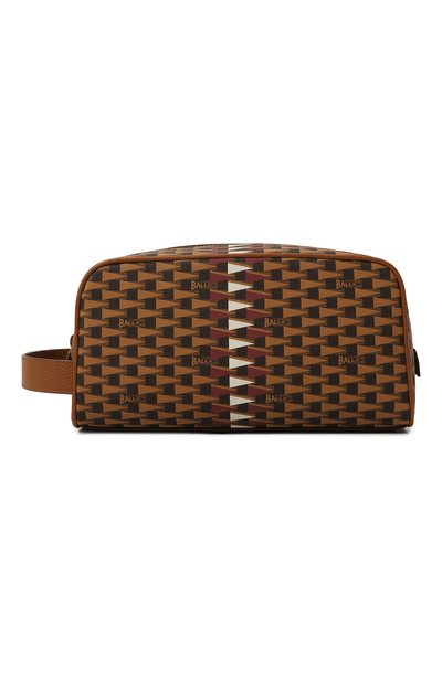 Для пошива коричневого несессера использовали плотный фактурный материал с брендированным узором в виде вымпелов. На передней и задней панелях элементы мотива окрасили так, чтобы сымитировать фирменные полосы Bally Stripe. Отделку по краям и широкую ручку сбоку изготовили из зернистой кожи.