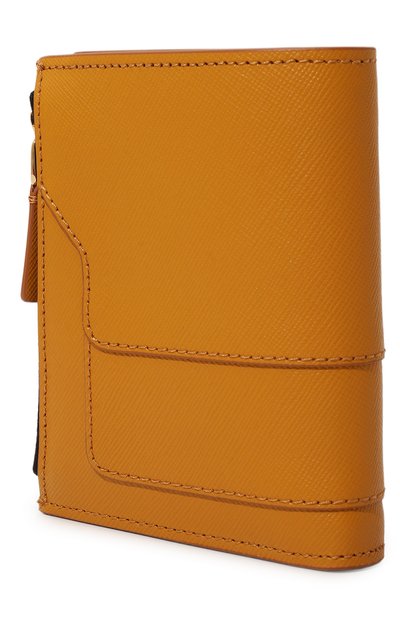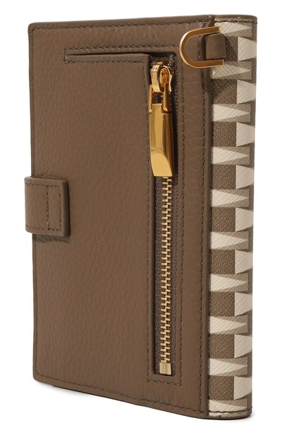 Портмоне с длинной ручкой-петлей на карабине выполнили из мягкой зернистой кожи. Для широкого клапана с ремешком на кнопке использовали плотный текстиль с полиуретаном, на котором напечатали принт Pennant. Внутри есть три слота для карт и три отделения для чеков, а снаружи — карман на молнии.