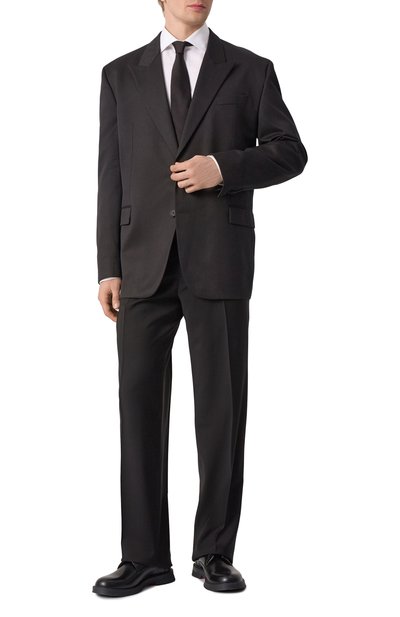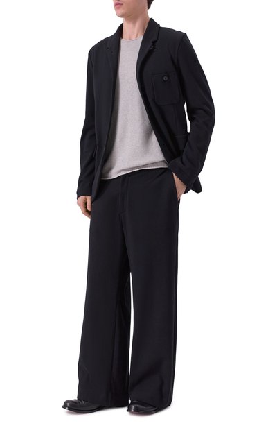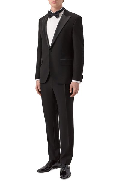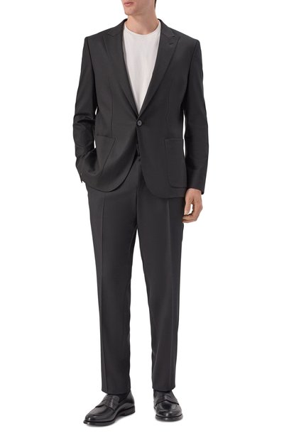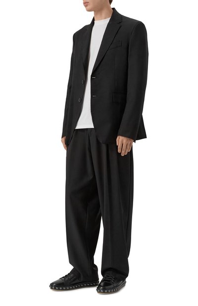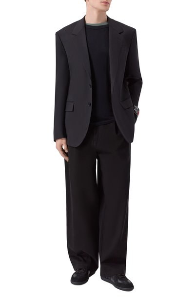 Строгий пиджак превратили в эффектный акцент, украсив широкие лацканы кристаллами, золотистыми и серебристыми заклепками, а левый рукав – красным фирменным патчем. Яркость декора оттенили черным текстилем из прочного полиэстера и мягкой шерсти первого пострига. В состав материала включили эластан, а сзади сформировали высокие шлицы, поэтому полуприталенная модель не сковывает движения. Помимо двух боковых карманов изделие дополнили внутренними.