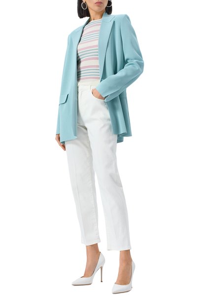 Белые зауженные джинсы одинаково хорошо сочетаются как с темной, так и с яркой одеждой. Доменико Дольче и Стефано Габбана выбрали для пошива модели с завышенной посадкой, деликатно корректирующей силуэт, тонкий прочный деним с добавлением небольшого процента стрейчевых волокон. Задний карман украсили фирменной двухслойной пласти ной с выгравированным логотипом.