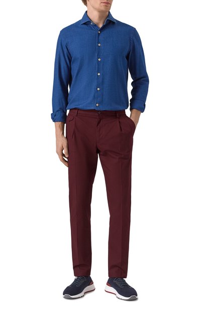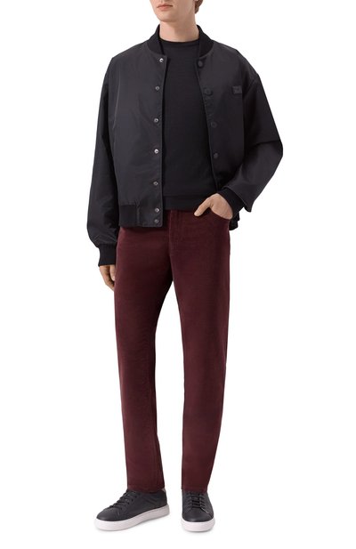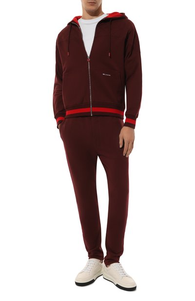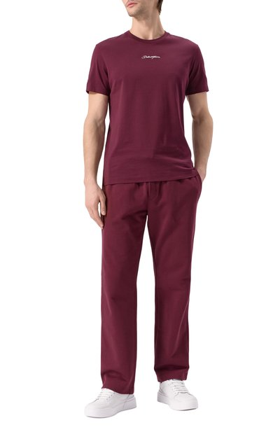 Брюки с рифленым поясом-кулиской сшили из хлопкового трикотажа. Один из трех карманов украсили фирменной двухслойной пластиной.