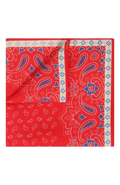 Ярко-красный платок с контрастным узором пейсли может стать акцентной деталью строгого образа. Для изготовления аксессуара использовали мягкий хлопковый твил, усиленный гладким нежным шелком. Края изделия подшили вручную аккуратным роликом, поэтому он не потеряет форму со временем.