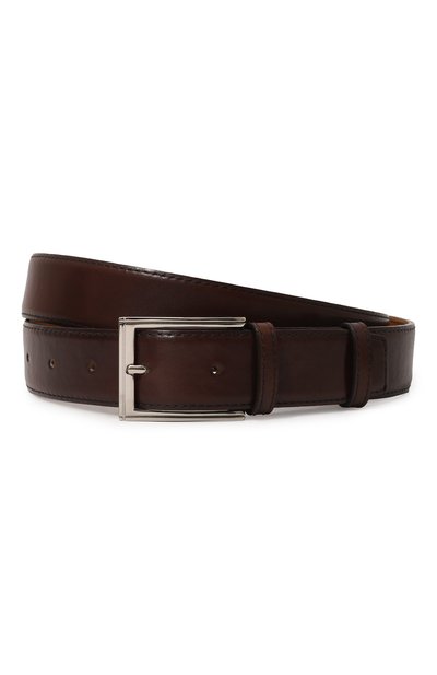 Темно-коричневый ремень выполнен вручную из прочной матовой кожи. Со временем она покрывается тонкой паутиной благородной патины, а изделия из нее приобретают винтажный вид. Аксессуар дополнен зеркальной пряжкой с выгравированным логотипом марки.