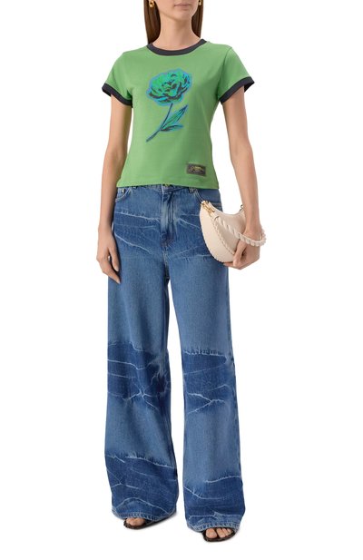 Футболку будто бы выцветшего оттенка морской волны украсили спереди зеленым принтом со слоганом Earth My kind of friend. Следуя этому призыву, для пошива модели использовали мягкое дышащее джерси, в котором смешали первичный хлопок и переработанный.