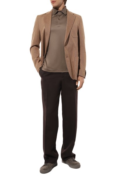 Серое поло с короткими рукавами выполнено из гладкого хлопкового трикотажа с легким блеском. Материал с шелковистой текстурой хорошо пропускает воздух, а одежда из него не пилингуется и комфортно облегает тело, не сковывая движения. Швы отделаны контрастным кантом. Модель, застегивающаяся короткой молнией, украшена вышитой эмблемой марки.