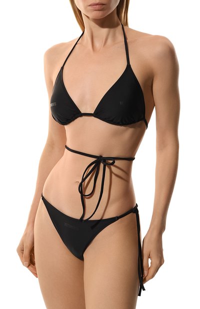 Черное бра с мягкими треугольными чашечками изготовили из эластичной микрофибры, благодаря чему изделие не боится воздействия соленой и хлорированной воды, приятно ощущается на коже и слегка тянется, комфортно облегая фигуру. Узкие бретели модели зарифмовали с поясом, выполненным из тонких переплетенных шнуров.