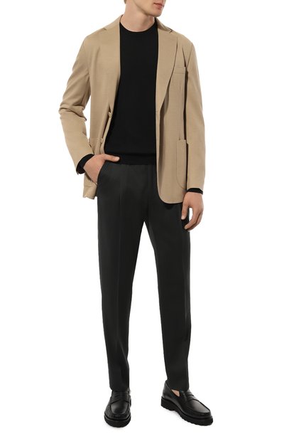 Облегченная конструкция бежевого пиджака с тонким полуподкладом делает силуэт мягче, а посадку — естественнее. Модель с двумя шлицами сшили из фактурного материала на основе шерсти первого пострига и прочного шелка, придавшего ткани деликатный блеск. Чтобы сделать текстиль более дышащим, в состав включили лубяные волокна льна.