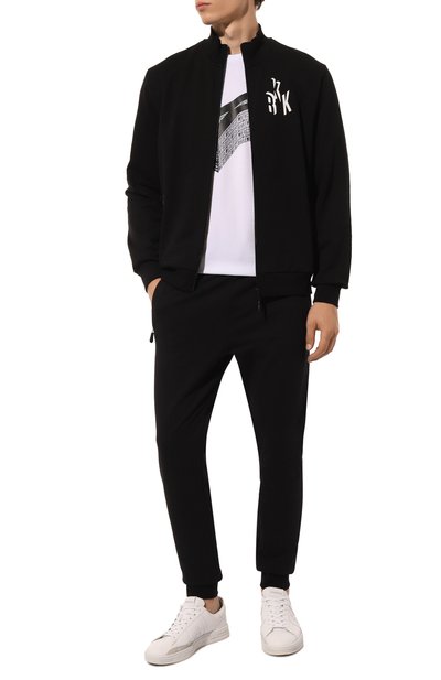 Спортивные брюки свободного силуэта с манжетами сшили из плотного хлопкового футера с добавкой эластичных нитей. Модель с тремя карманами дополнили эластичным поясом-кулиской, мягко облегающим талию. Слева — миниатюрный патч с контрастным логотипом.
