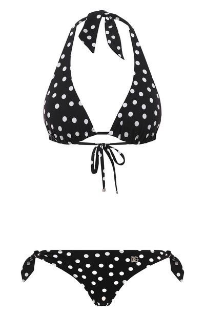Черно-белый раздельный купальник в горох сшили из эластичного материала, который быстро сохнет. Плавки с широкими завязками по бокам украсили спереди серебристой монограммой DG. Бра с треугольными чашечками дополнили двумя парами бретелей — тонкие укрепили на концах квадратными эглетами.