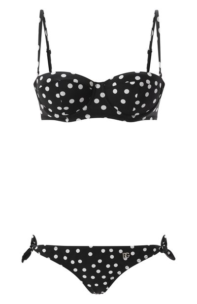 Белый горох на черном фоне придает раздельному купальнику из нежной быстросохнущей микрофибры ретрозвучание. Бра со съемными бретелями и плотными чашечками, комфортно поддерживающ ими грудь, застегивается замком-защелкой в виде монограммы DG сзади. С ним рифмуется накладка на плавках-бикини, регулируемых завязками по бокам.
