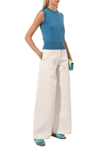 Голубой однотонный топ, созданный Доменико Дольче и Стефано Габбана, представлен эксклюзивно в ЦУМе. Облегающую модель, вдохновленную строгостью и элегантностью одежды из 1960-х, изготовили из приятного на ощупь шелкового трикотажа, который не подвержен пилингу и долго выглядит безупречно.