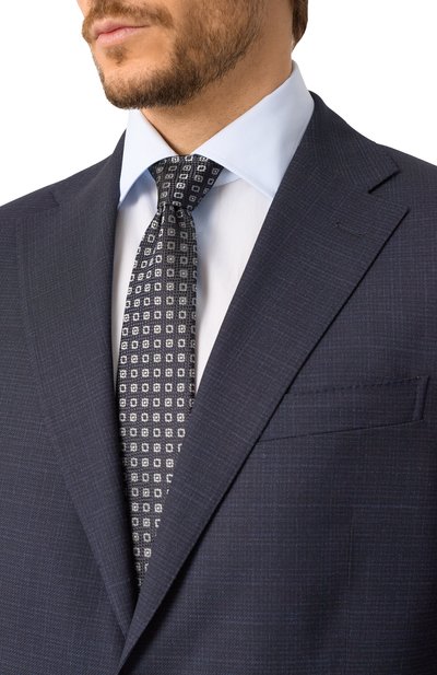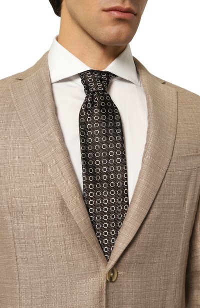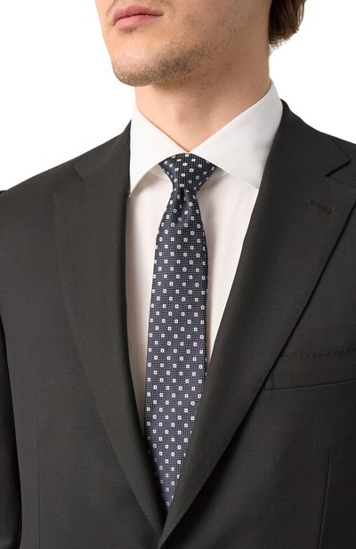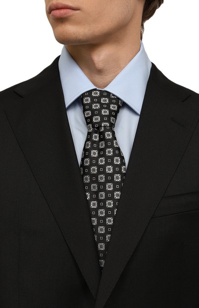 Галстук с черно-белым паттерном в виде монограммы DG сшили из фактурного прочного шелка с характерным блеском. Задний шов, выполненный вручную в одну нить, эластичнее машинного, поэтому аксессуар не перекручивается, а узлы получаются скульптурными и объемными.
