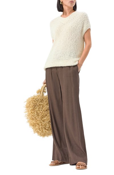 Свободные бежевые брюки окрасили в технике тай-дай, не подразумевающей существования двух абсолютно одинаковых вещей. Для пошива модели с высокой посадкой использовали тонкий хлопковый твил, который почти не мнется и хорошо пропускает воздух. Изделие с регулируемым поясом-кулиской дополнили сзади текстильной перемычкой, словно удерживающей глубокие защипы, а спереди – горизонтальными складками, имитирующими многослойность.