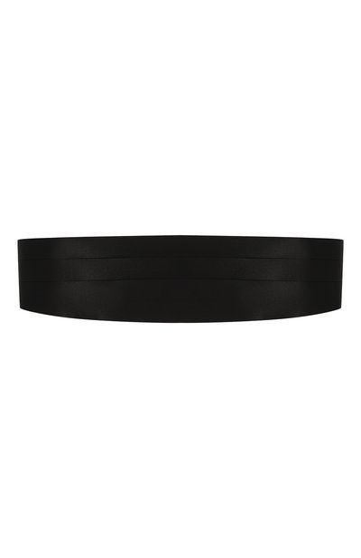 Черный камербанд с двумя складками выполнили вручную из плотного шелка с легким блеском. Отрегулировать посадку аксессуара позволяют миниатюрные слайдеры на четырех узких лентах сзади. Модель застегивается ремешком в тон и небольшой пряжкой.