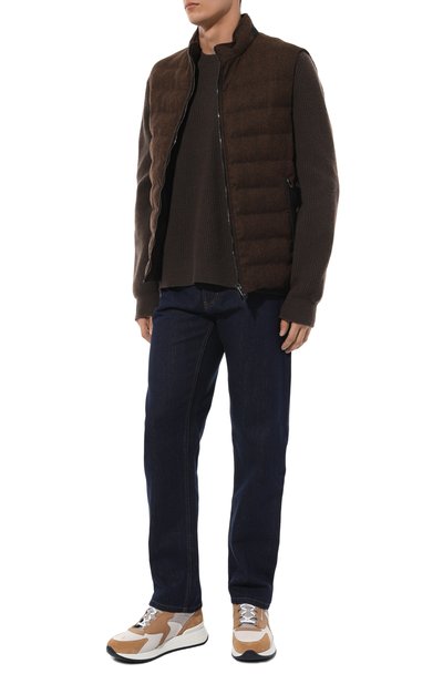 Низкие кеды с серебристым логотипом на язычке сшили из пластичной зернистой кожи, которая быстро подстраивается под силуэт стопы. Задник, мыс и основание шнуровки дополнили гладкими бежевыми накладками, делающими пару с перфорацией прочнее. Обувь на легкой полимерной подошве смягчает каждый шаг.